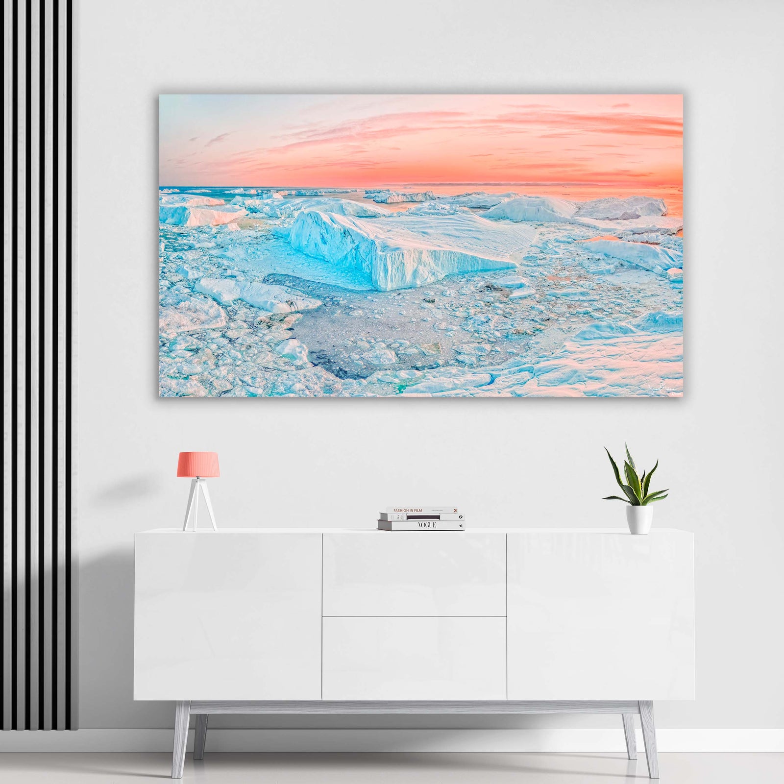 This unique collection of Fine Art Prints illustrates the beauty of the frozen world in our planet. These Wall Art Prints focus on the gorgeous icebergs and the beautiful light of the midnight sunset. Each piece is unique and exclusive and difficult to find elsewhere since icebergs are changing every minute and they are truly short lived. So the images in this collection are very rare and help to preserve for all eternity the immense beauty of the frozen world in the midnight sun. From a design perspective, this collection offers a beautiful combination between warm and cold tones, which offer a perfect balance to bring elegance and sophistication to any room.